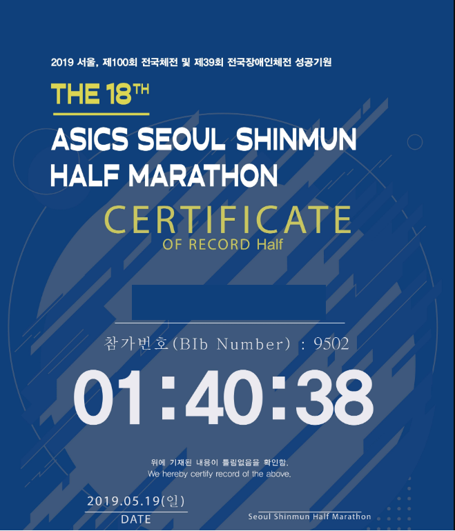 2번째 하프마라톤은 정말 1시간40분의 벽을 깨고싶었지만 38초차이로 실패하였습니다. 더 열심히하라는 업보겠지요. 꾸준히 달리는 수밖에 없을것 같습니다.